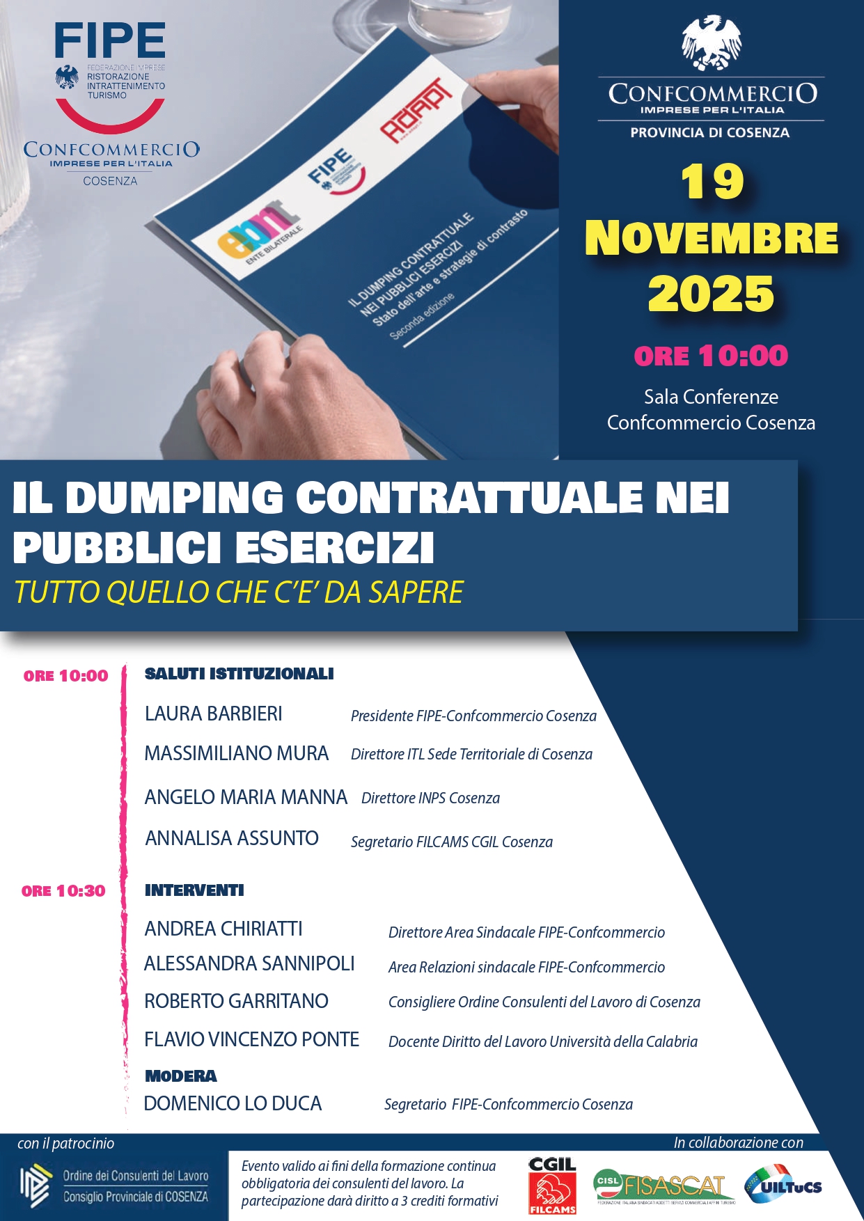 La FIPE Confcommercio Cosenza organizza per mercoledì 19 novembre 2025, alle ore 10:00 presso la Sala Conferenze di Confcommercio Cosenza, un incontro dal titolo “Il dumping contrattuale nei pubblici esercizi: tutto quello che c’è da sapere”.